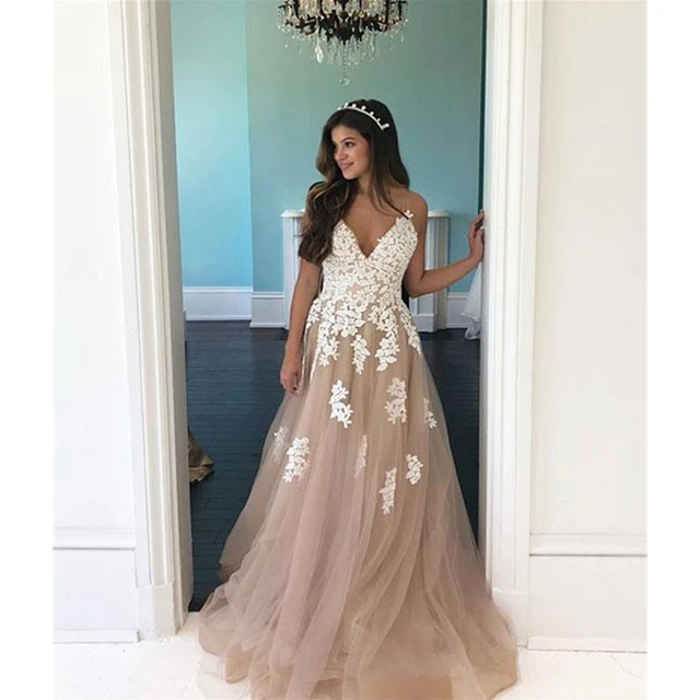 2018 Champagne Tulle Evening Dress With White Lace Sexy Backless Spaghetti Strap A Line Long Prom Gowns Robe De Soiree Cheap