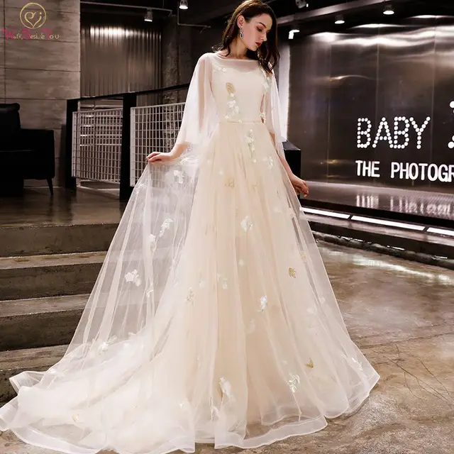 Walk Beside You Champagne Evening Dresses Romantic 3/4 Sleeves Cap Sleeves Boat Neck Tulle Sweep Train 2018 Long Prom Gown Stock