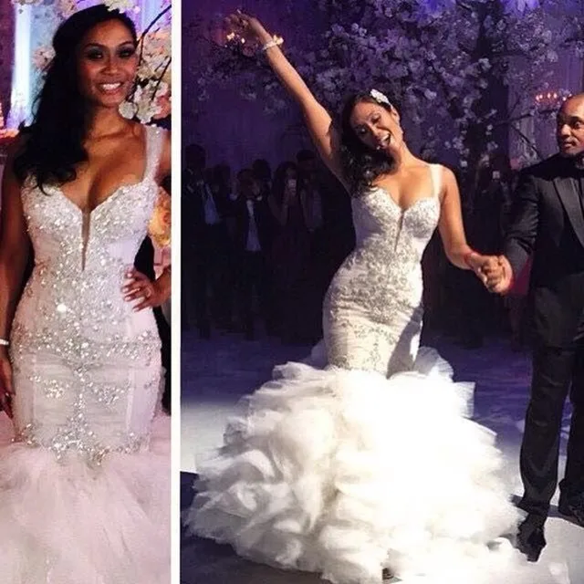 2018 Vintage Wedding Dresses Beads Crystals Sheer Rhinestone Spaghetti Straps Puffy Bakcless Mermaid Wedding Gowns Formal Dress