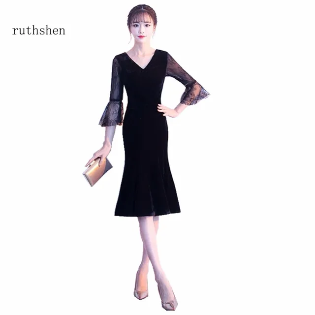 ruthshen Stunning Short Cocktail Dresses Black Long Sleeves Formal Prom Knee Length Lace Mermaid Cocktail Party Dress Vestidos