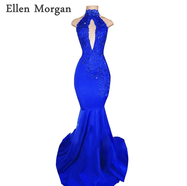 Backless Royal Blue High Neck Mermaid Prom Dresses 2018 for African Black Girls with Lace Beaded Sexy Long Vestido De Festa