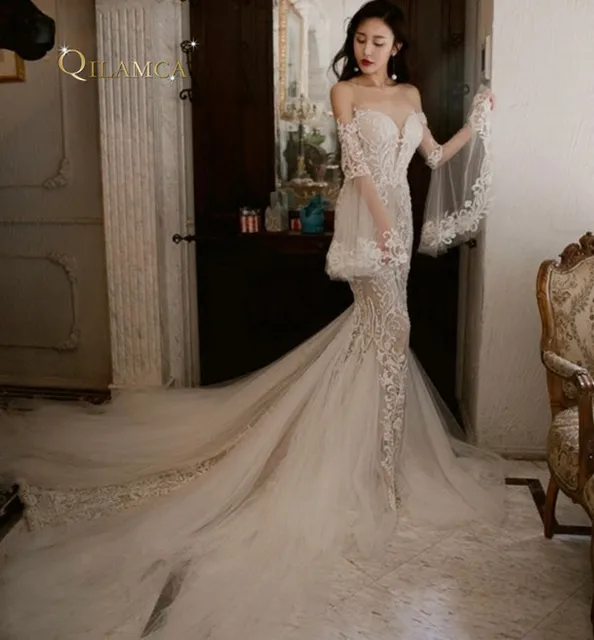 Custom Made Vintage Lace Mermaid Long Sleeves Wedding Dresses 2018 Sheer Romantic Wedding Gowns vestidos de noiva robe de mariee