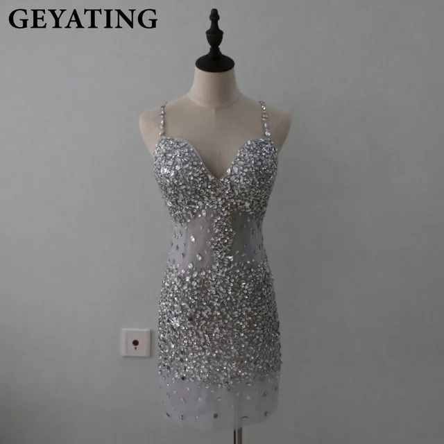 Bling Bling Silver Gray Beaded Crystals Short Cocktail Dresses 2018 Spaghetti Straps Backless Party Prom Dress