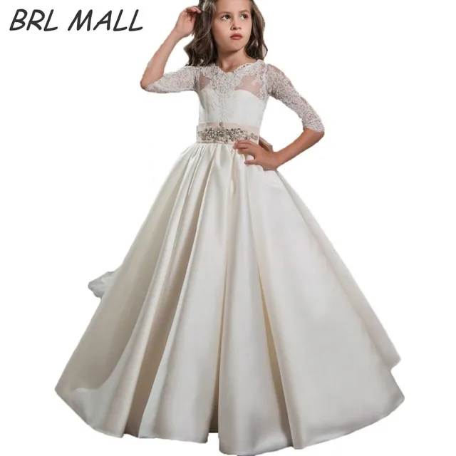 Elegant ivory first communion dresses for girls 2018 Lace Appliques Half Sleeves flower girl dresses with bow vestido longo