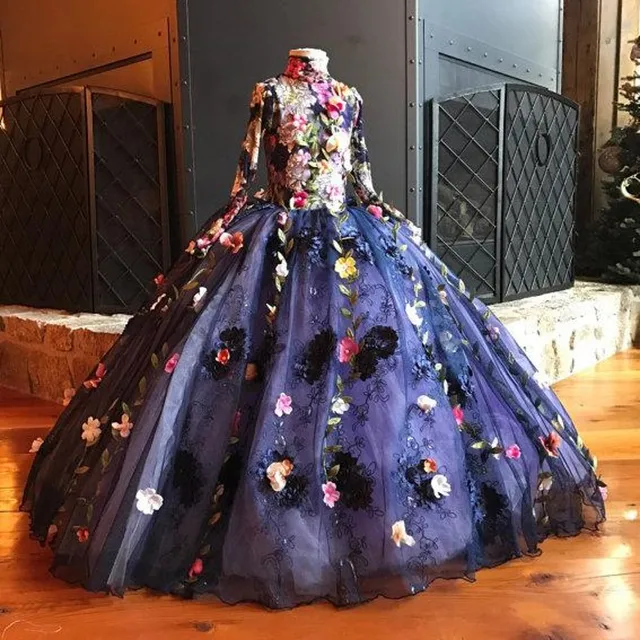 Navy Blue Flower Girls Dresses For Weddings Full Sleeves robe fille Flowers Lace Tulle Girls Pageant Gowns 3D Floral Custom Made