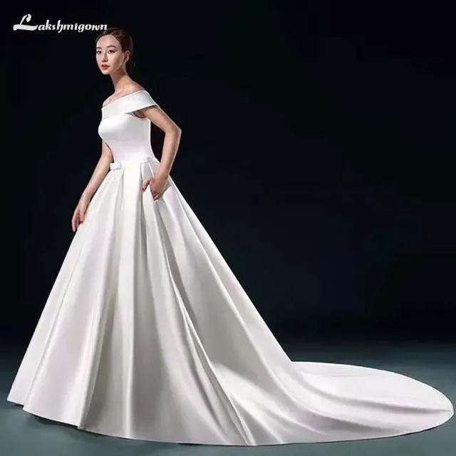 White Stain Wedding Dresses 2018 Simple Bow Floor-Lenth Court Train Boat Neck Lace-up Bridal Gown Party Dresses