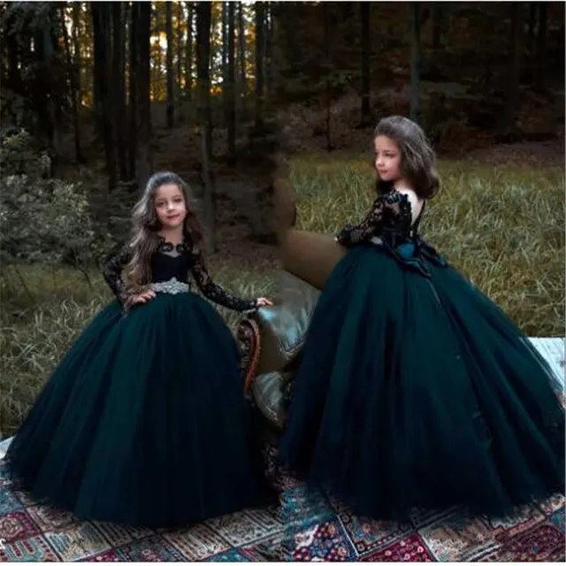 2018 Arabic Black Swan Flower Girls Dress For Wedding Long Sleeves Lace Appliques Ball Gown Birthday Girl Communion Pageant G