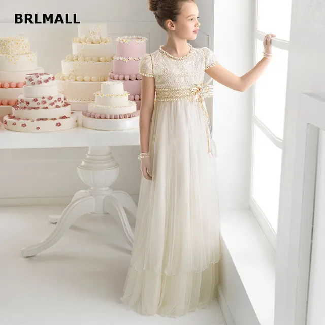 2019 Cheap Custom Made Short Sleeve Tulle Lace A Line Flower Girl Gowns primera first communion dresses for girls