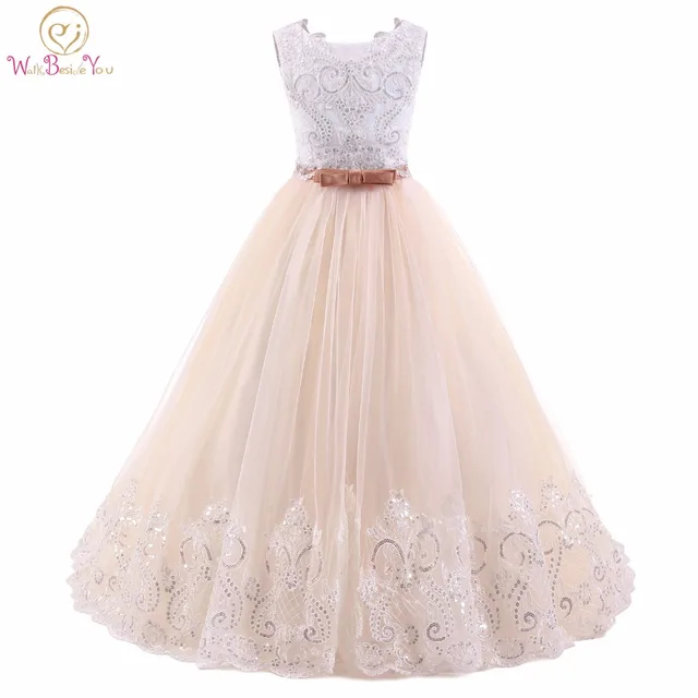Abito Comunione Champagne White Flower Girl Dresses Sleeveless Ball Gown Kids Evening Gown vestido comunion Prom Dresses Girls