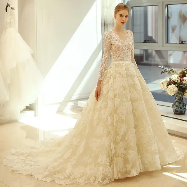 It's Yiiya Sexy Zipper V-neck Backless Train Illusion Bride Gown Lace Trailing Wedding Dress Vestidos De Novia Casamento Y8010