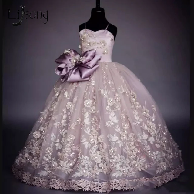 Pretty Crytsal Kids Communion Dresses Appliques Big Cute Bow Pageant Dresses For Girls Long Ball Gowns Lace Flower Girl Dress
