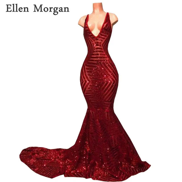 Red Sequined Mermaid Prom Dresses 2018 for African Black Girls Sexy V Neck Zipper Long Vestido De Festa for Party Gowns