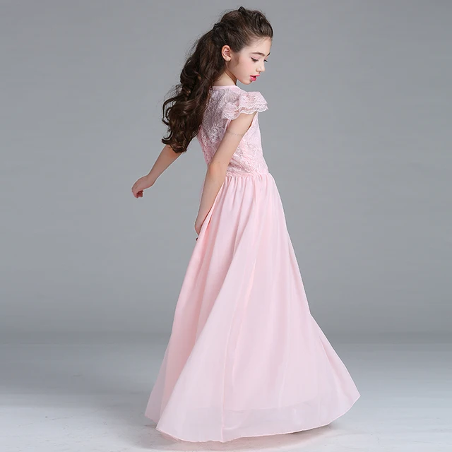 Retail Personalize Lace Chiffon Flower Girls Long Dress Short Sleeves Heart Neck Noble Girls Evening Party Dress lace005