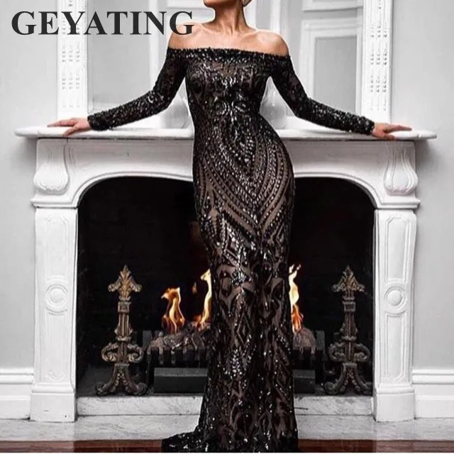 Saudi Arabic Black Sequins Mermaid Evening Dress Long Sleeves Off Shoulder Elegant Women Formal Dress Party Prom Dresses 2018