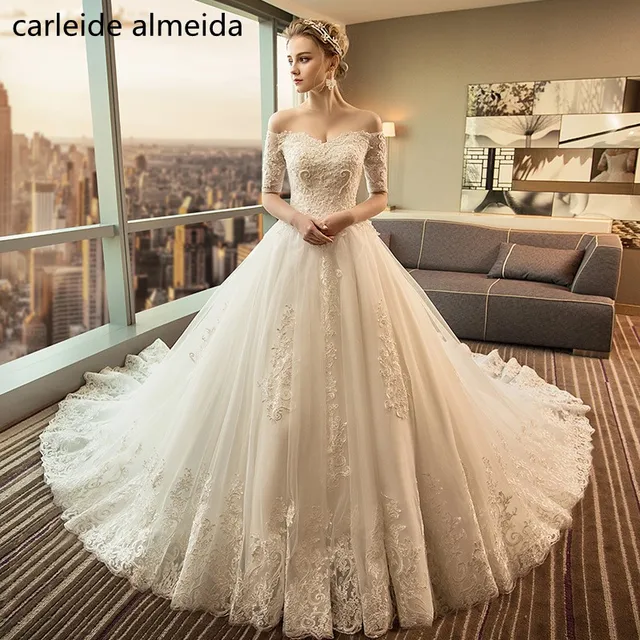 Vestido de Noiva Off-the-Shoulder Ball Gown Wedding Dress 2018 with Half Sleeves 3D lace appliques Robe de mariee