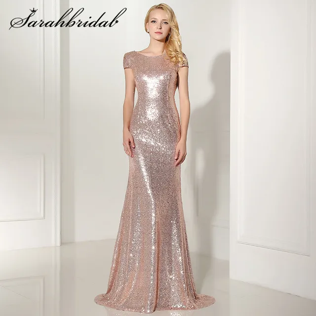 Sexy Backless Rose Gold Sequined Evening Dresses Cap Sleeves Mermaid Long Cheap Party Gown Vestido De Festa Longo SD347