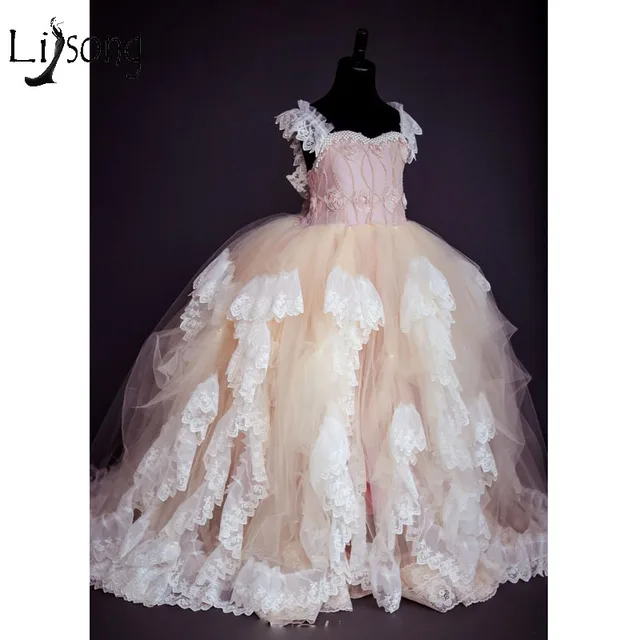 Cute Champagne Tutu Flower Girl Dresses 2019 Beaded Puffy Ball Gowns Kids 3D Flower Communion Dresses Pageant Dresses For Girls