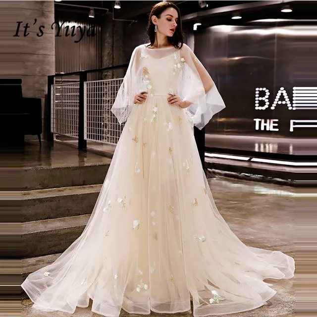 It's YiiYa Evening Dress 2018 Embroidery Floral Champagne O-neck Big Sleeve A-line Train Dinner Gowns LX1286 robe de soiree