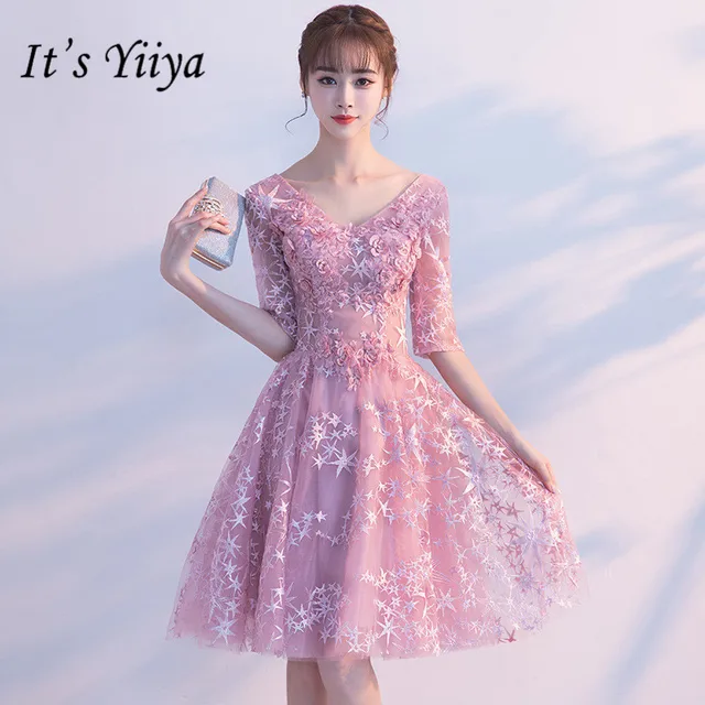It's YiiYa Pink V-neck Half Sleeve Bridesmaid Dresses Elegant Appliques Ankle-length Slim A-line Frocks H242