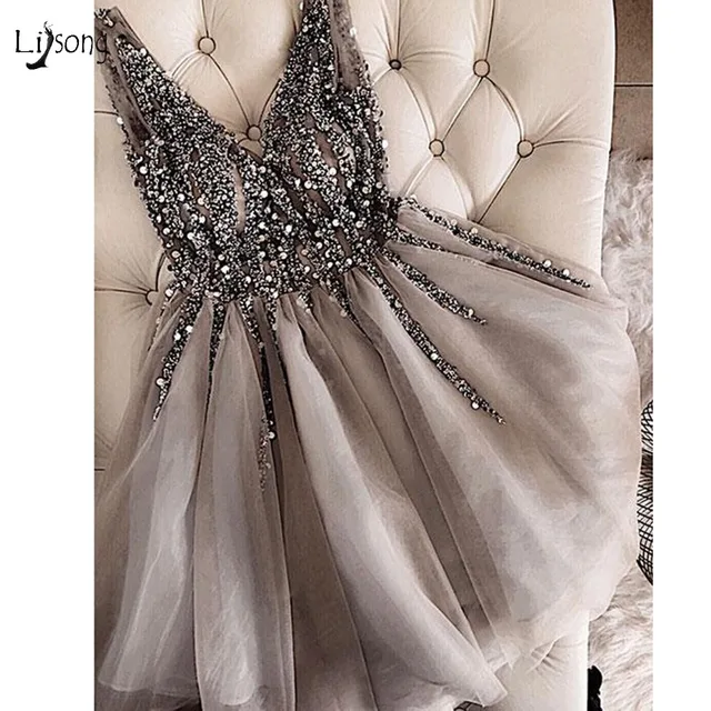 Sparkle Crystal Beaded Short Cocktail Dresses Gray Homecoming Dress Double V-neck Sexy Shiny Mini Prom Gowns Abiye Vestidos