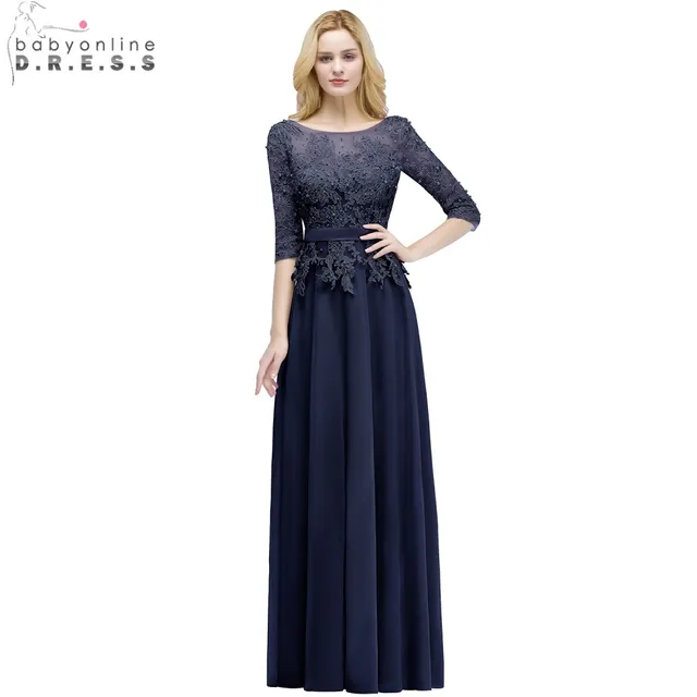 Babyonline Dust Pink 3/4 Sleeves Long Evening Dresses 2018 Lace Appliques Beaded Formal Dresses With Sash vestido de festa longo