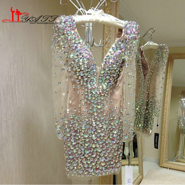 Liyatt Amazing GlamorousColorful Crystal Long Sleeves V-neck Blining Cocktail Dresses 2016 Sexy Mini Women Party Dress