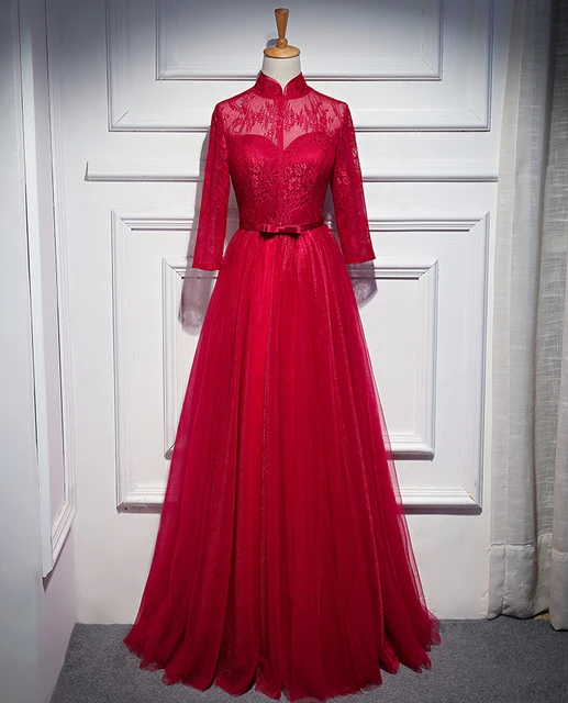 Wine Red Small High Neck A Line Illusion Long Evening Dresses 2018 Embroidery Half Sleeves Lace up Formal Evening Dress